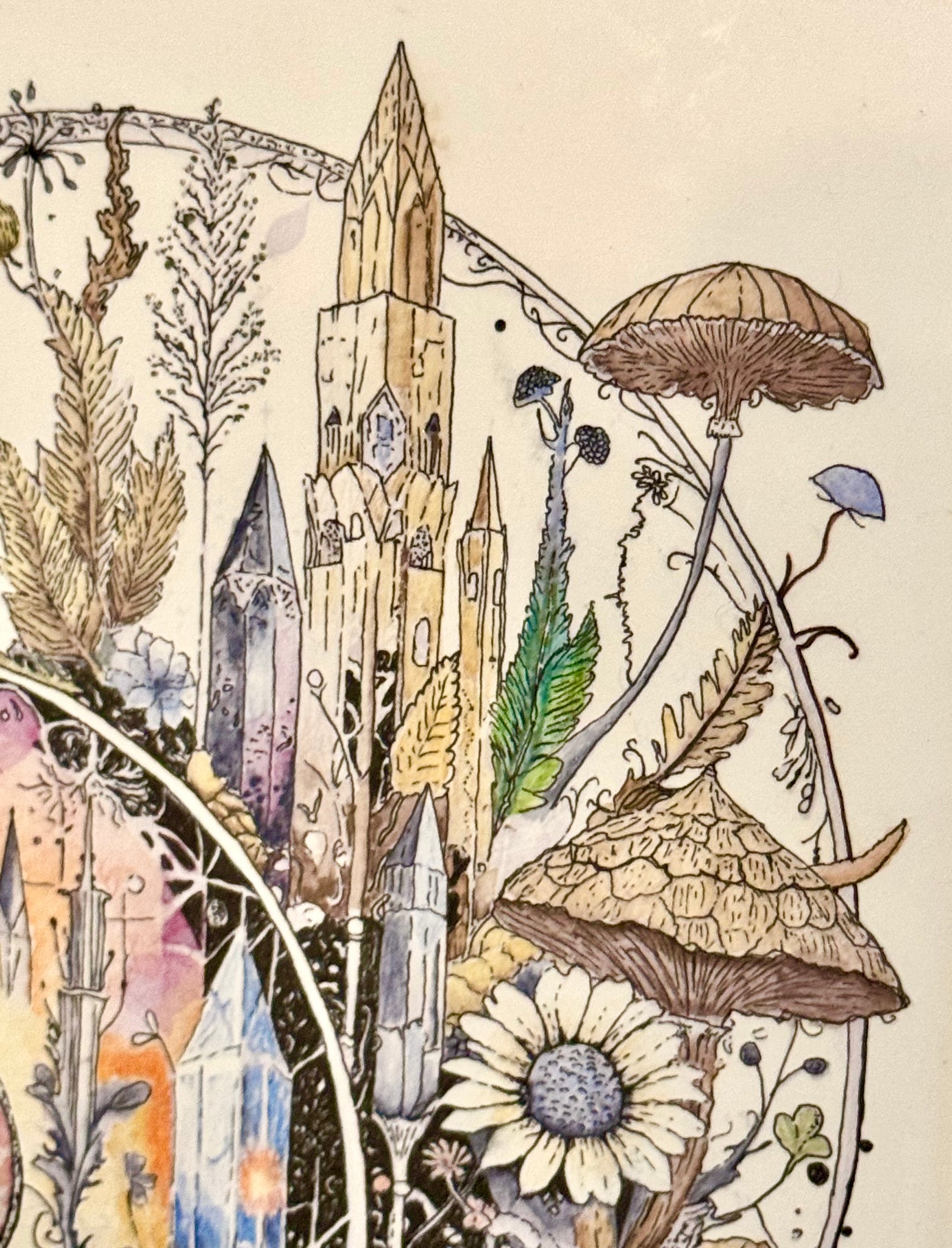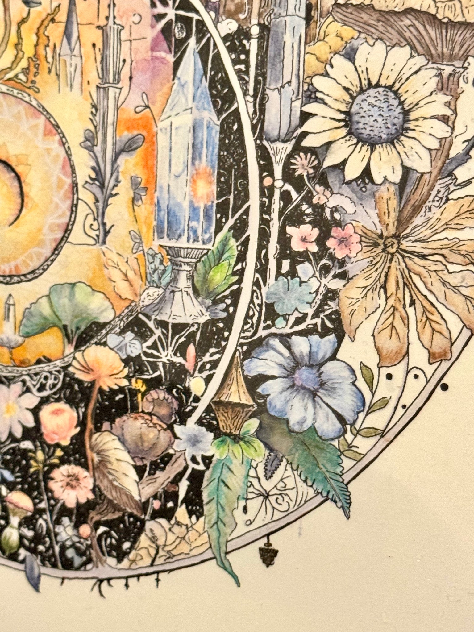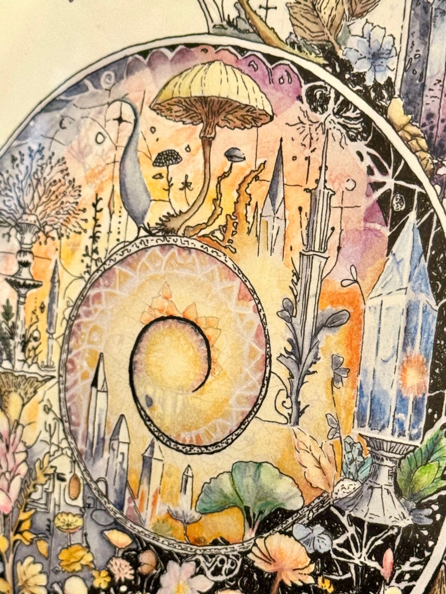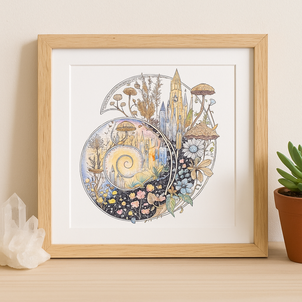 A meditation on time and transformation, Ammonitae captures an ancient spiral blooming with new life. Painted in soft washes of watercolor and ink, crystal spires rise from the fossil’s curve, fungi unfurl like tiny galaxies, and delicate blossoms spill through the chambers — a vision where earth’s deep memory meets rebirth.