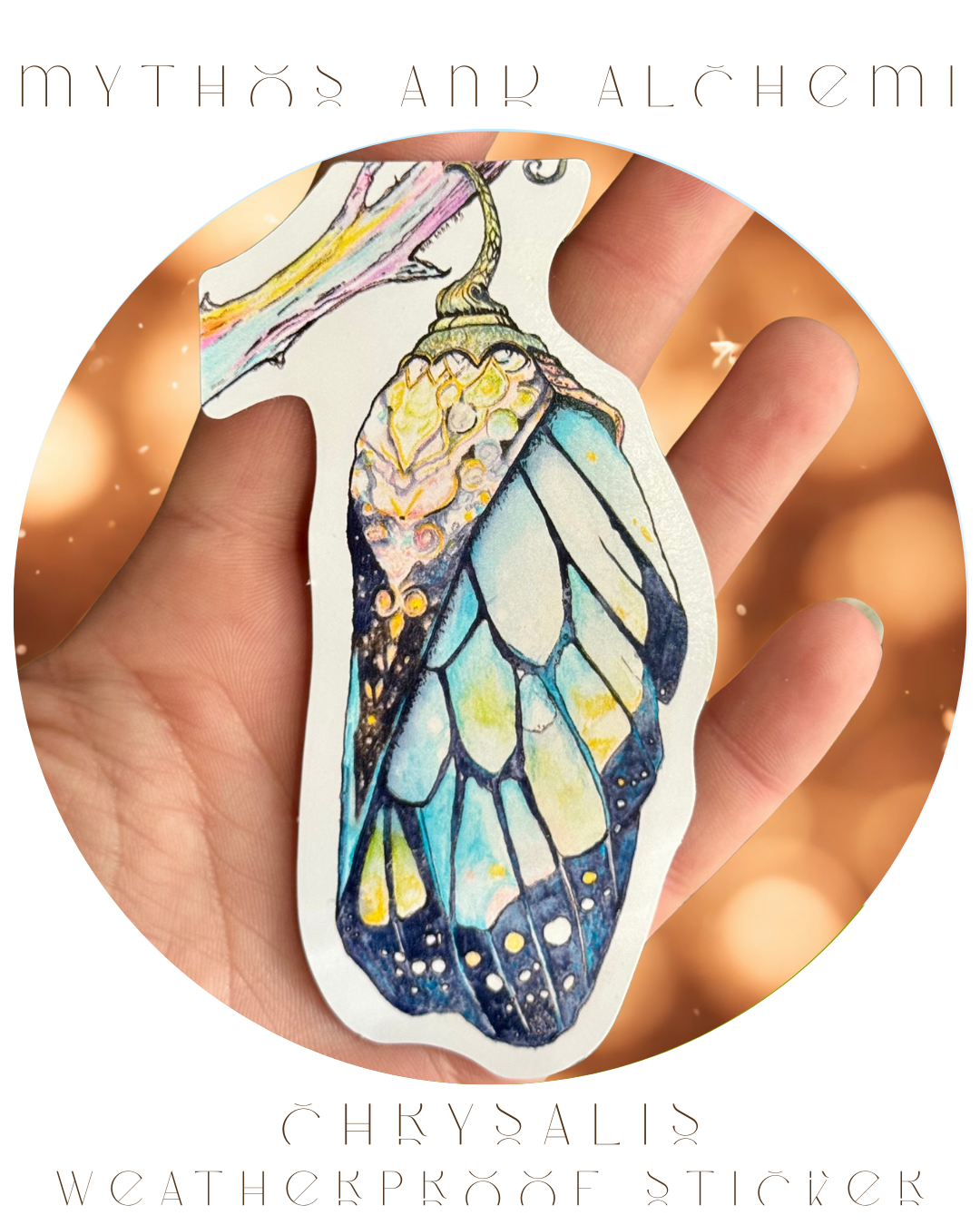 Suspended from a branch like a lantern of possibility, the chrysalis glows with soft blues, moon-washed golds, and opalescent light. Its delicate wing-forms are already visible, curled and waiting, as if the future self is whispering through thin walls of shimmering silk.
