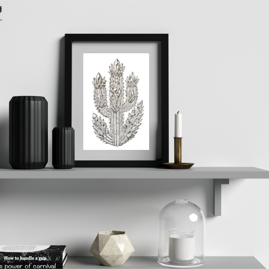Printed on archival, museum-quality paper, this art print preserves every fine detail and shimmering hue of the original piece. It’s a gentle statement of balance and endurance — where cactus roots meet crystalline spirit.