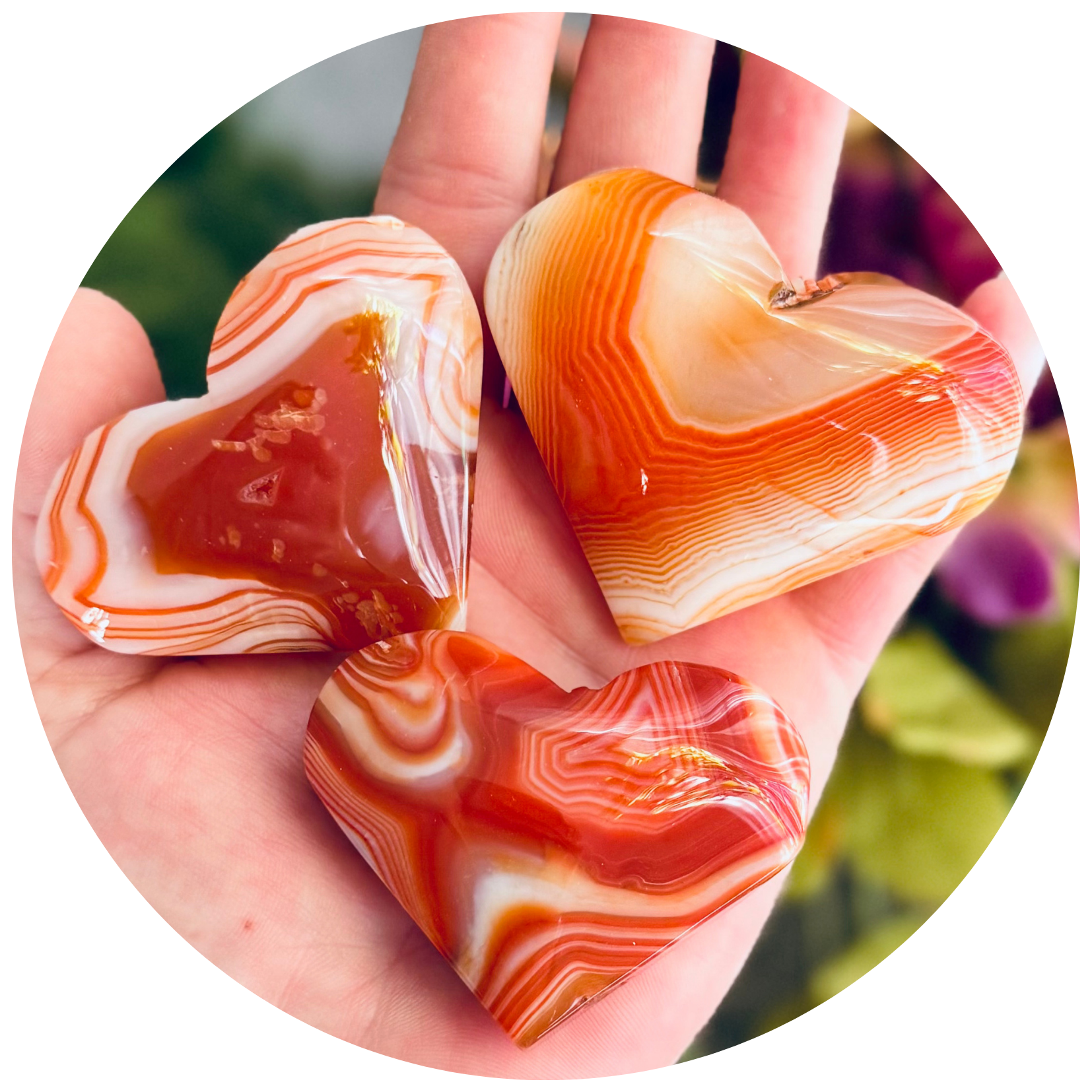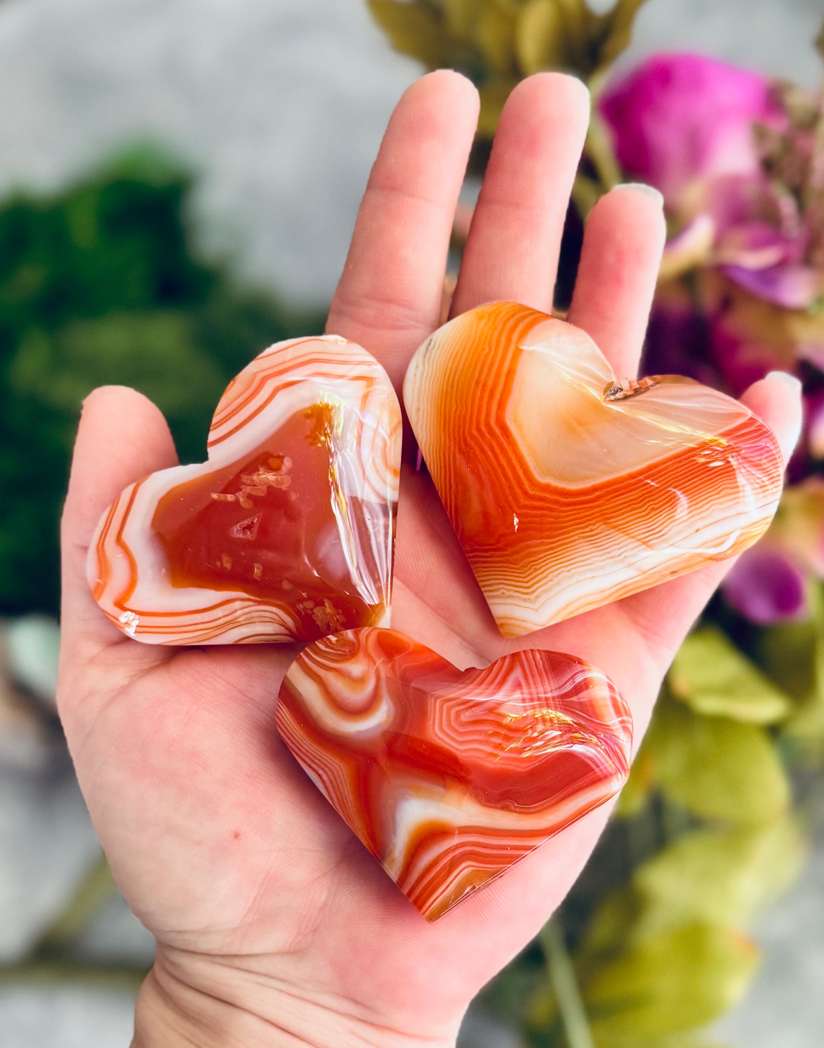 These Banded Carnelian Hearts are bold, luminous, and full of movement. Rich layers of fiery orange, deep red, and creamy white ripple through each heart in dramatic natural bands — no two alike, and all impossible to ignore.
