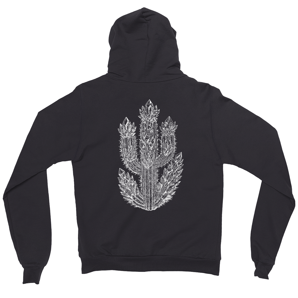 The White Crystal Cactus Hoodie features my hand-drawn, highly detailed crystal-encrusted cactus illustration—a fusion of desert resilience and raw mineral magic. Every spire, spike, and crystal cluster is rendered in luminous white linework, giving the design an almost carved, illuminated appearance against the fabric.
