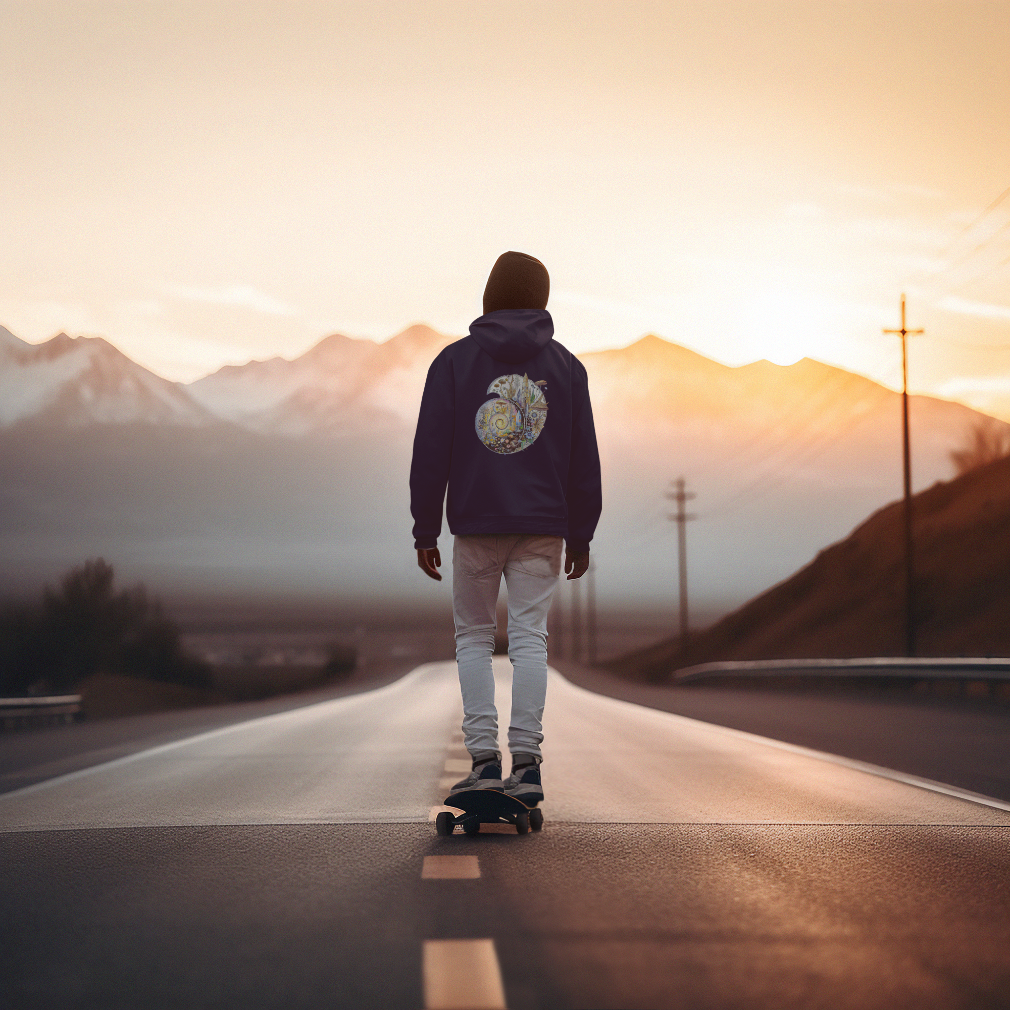 On the back, the Ammonitae spiral blooms—an ancient fossil cracked open into a universe of crystals, mushrooms, flowers, pathways, tiny dream-towers and hidden light. It’s not just an illustration; it’s a map of a world that exists somewhere between memory and imagination. When you wear it, you can feel the quiet pulse of it… like the hoodie is carrying a secret only you understand.