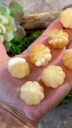 Each mini pumpkin is carved from natural, glowing orange calcite, a stone known for its warm, uplifting energyâperfect for cozy nights, harvest celebrations, and Halloween dĂ©cor.